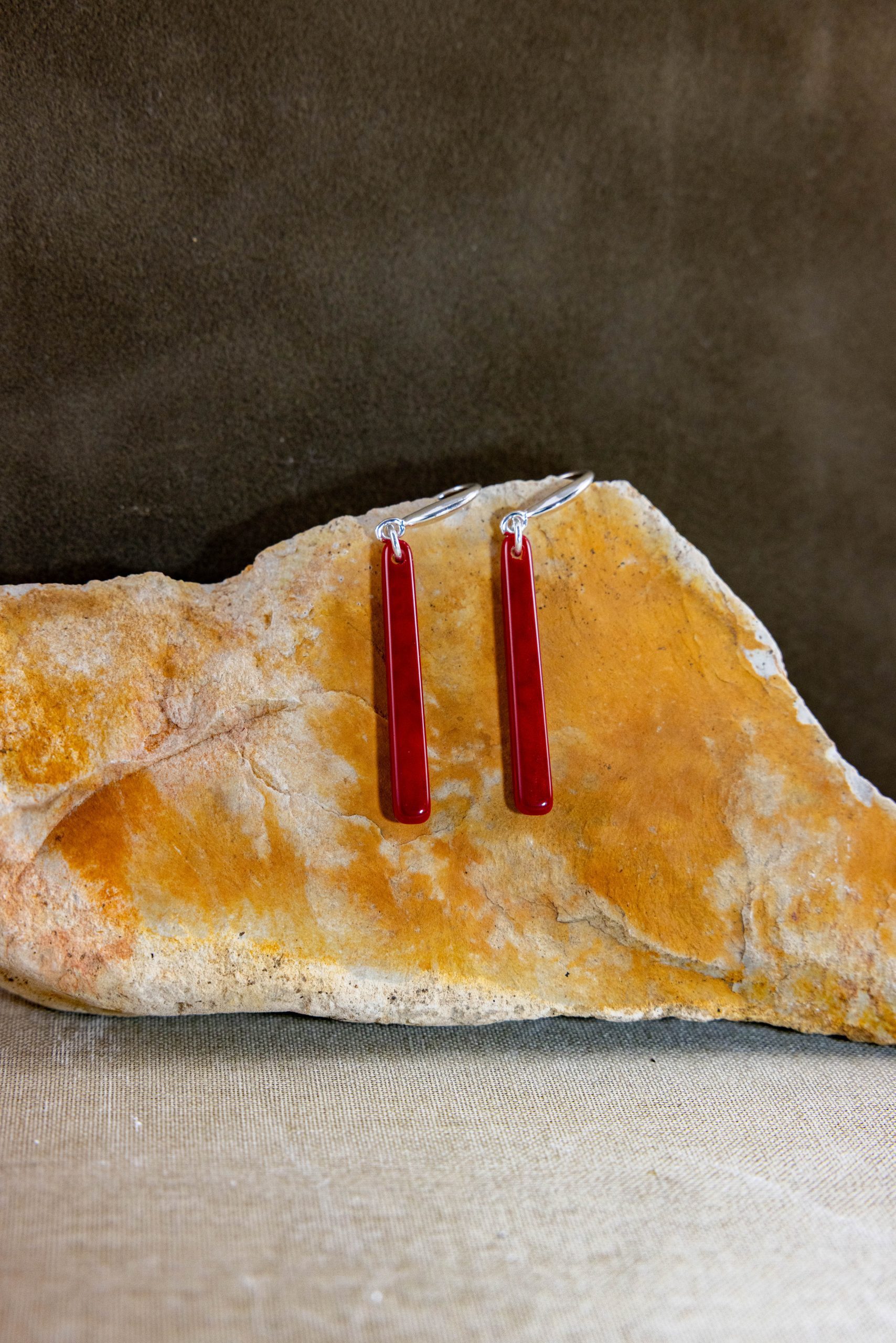 1 1/4″ long, solid apple-red stained glass, narrow rod shaped, hand shaped with precision, “Apple Of My Eye” provokes you to unleash your playfulness. Enhance your mood, day, goals, and motivation with this apple red set. This item is available for Reorder. To place an order, please see Reorder link. Keep in mind, each set will be hand made with unique characteristics. Lightweight. Recycled, Built with classy sterling silver hooks and rings.