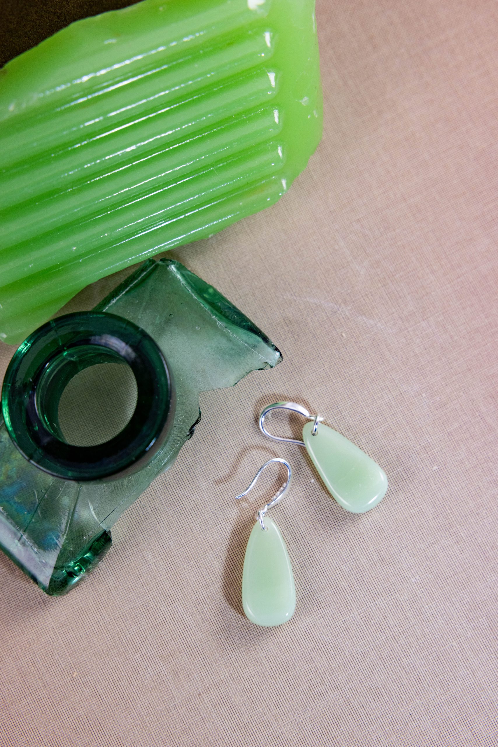 5/8″ long, seafoam jade colored glass, precious teardrop shaped droplets, hand shaped. Masterfully hancrafted, “Baby Jade Glass Droplets,” sprinkle your spirit with pure renewal. Refresh, restart, renew! Lightweight. Recycled. Built with sterling silver hooks and rings. One of a kind. Lightweight. Recycled. Built with classy sterling silver hooks and rings.
