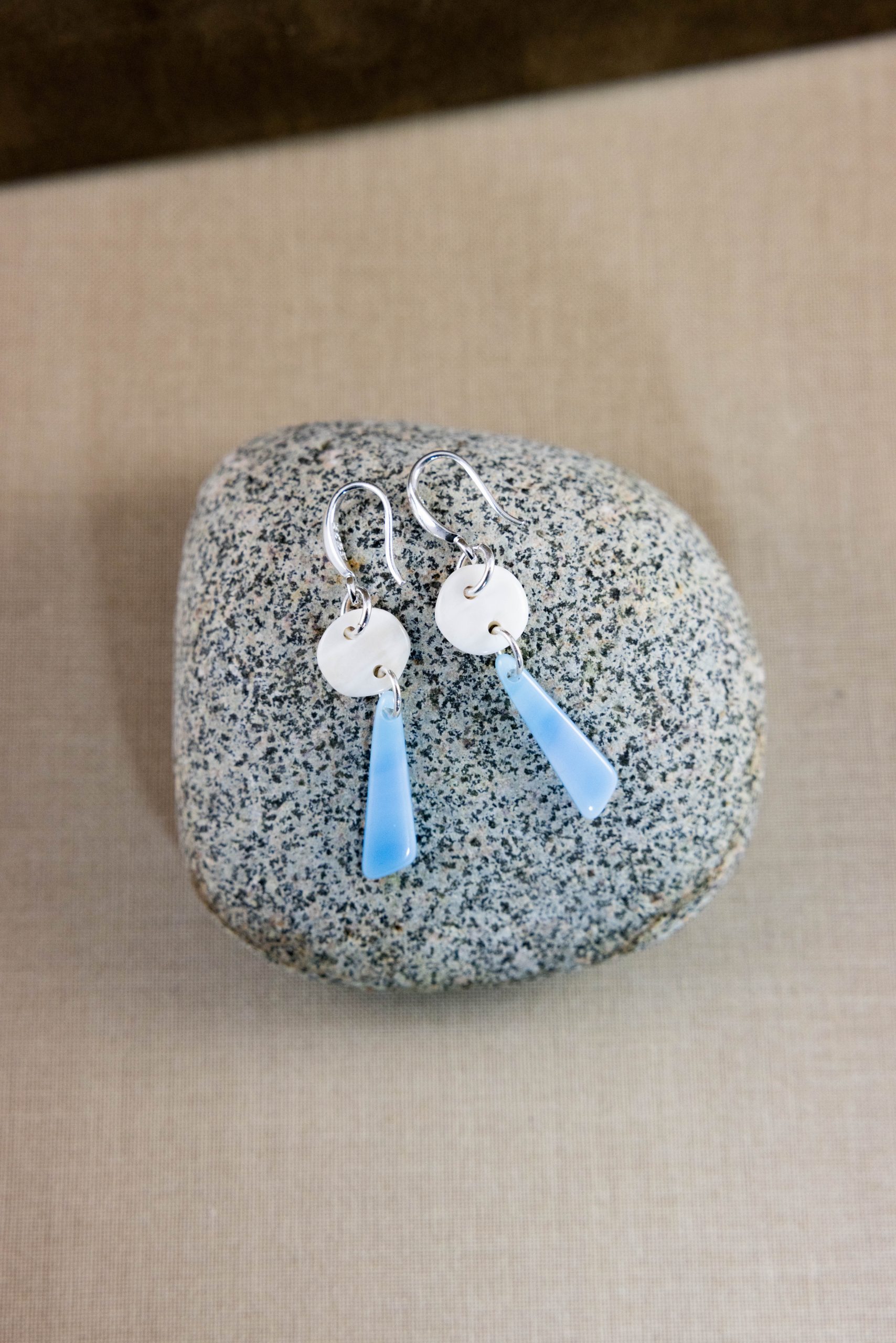 1 1/4″ long, 2 connecting pieces, morning-sky blue colored, tri sided, stained glass encompassing a gentle sweeping horizontal pattern, connected to a pronounced horizontally ridged wampum shell, which extends 11″ in diameter, presenting an endless circular shape. Handcrafted masterfully, these treasures have been delicately hand shaped in the process of their recreation. “Blue Bayou,” sings a story of love. Drift along the waters edge as you fall deeply into the most loving place imaginable. Wampum shells share a story never to be forgotten of American Indians and their descendants today of the 2 leggeds that marched the infamous Trail of Tears 1838-1839, resulting in the New Echota Treaty that was signed by Cherokee representatives. Wampum shells are said to be used for story telling and trades many moons ago. This item is available for Reorder. To place an order, please see Reorder link. Keep in mind, each set will be hand made with unique characteristics. Lightweight. Recycled, Built with classy sterling silver hooks and rings.