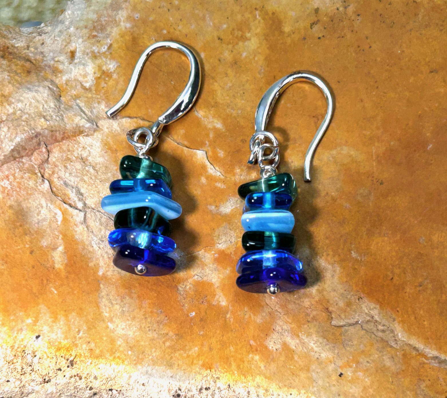 .5″ long encompassing 6 glass pieces including shades of ocean blue and meadow green, stacked top to bottom, “Blue Lagoon” recycled from discarded glass, recreated into small pieces, make a statement about utilizing what is within reach. Always believe in the power you have to make a positive impact on the world around you! This item is available for Reorder. To place an order, please see Reorder link. Keep in mind each pair will be uniquely handcrafted from recycled glass. Lightweight. Built on sterling silver hooks and rings.
