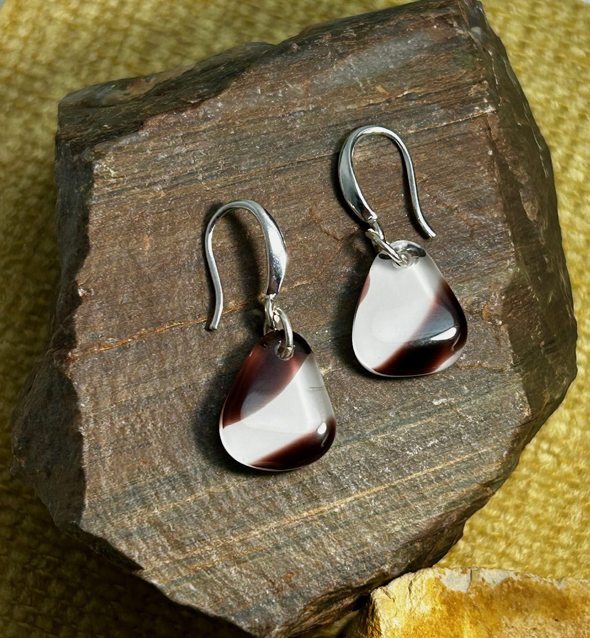 .5″ long caramel burgundy and creamy white striped glass, hand shaped into bee hives. This unique glass once lived in a magical garden located in Cardiff by the Sea, California. The land was sold and today the story continues to unfold. This one of a kind set, “Caramel Honey Hive,” lifts vibration, creating a buzz of energy around you. One of a kind. Lightweight. Built with classy sterling silver hooks and rings.