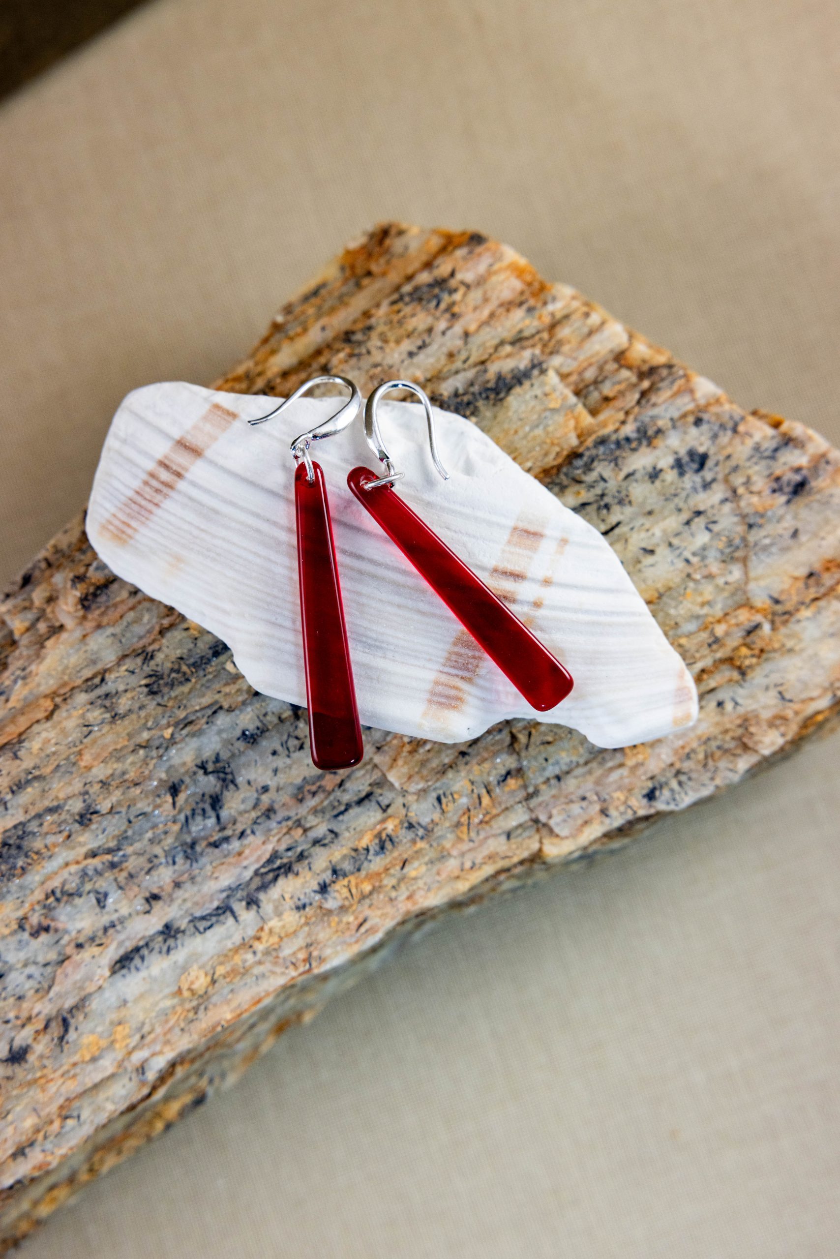 1 1/2″ long, shiny cherry-red glass, delicately shaped rods, hand shaped, recreated from rare cherry-red glass. “Cherry Blossoms” symbolize a reminder that life is delicate and fleeting, just like that of a Cherry Blossom, a short lived blossom of 2 weeks out of a year. Remember to pause and appreciate the now. Find peace in the present. This item is available for Reorder. To place an order, please see Reorder link. Keep in mind, each set will be hand made with unique characteristics. Lightweight. Recycled, Built with classy sterling silver hooks and rings.