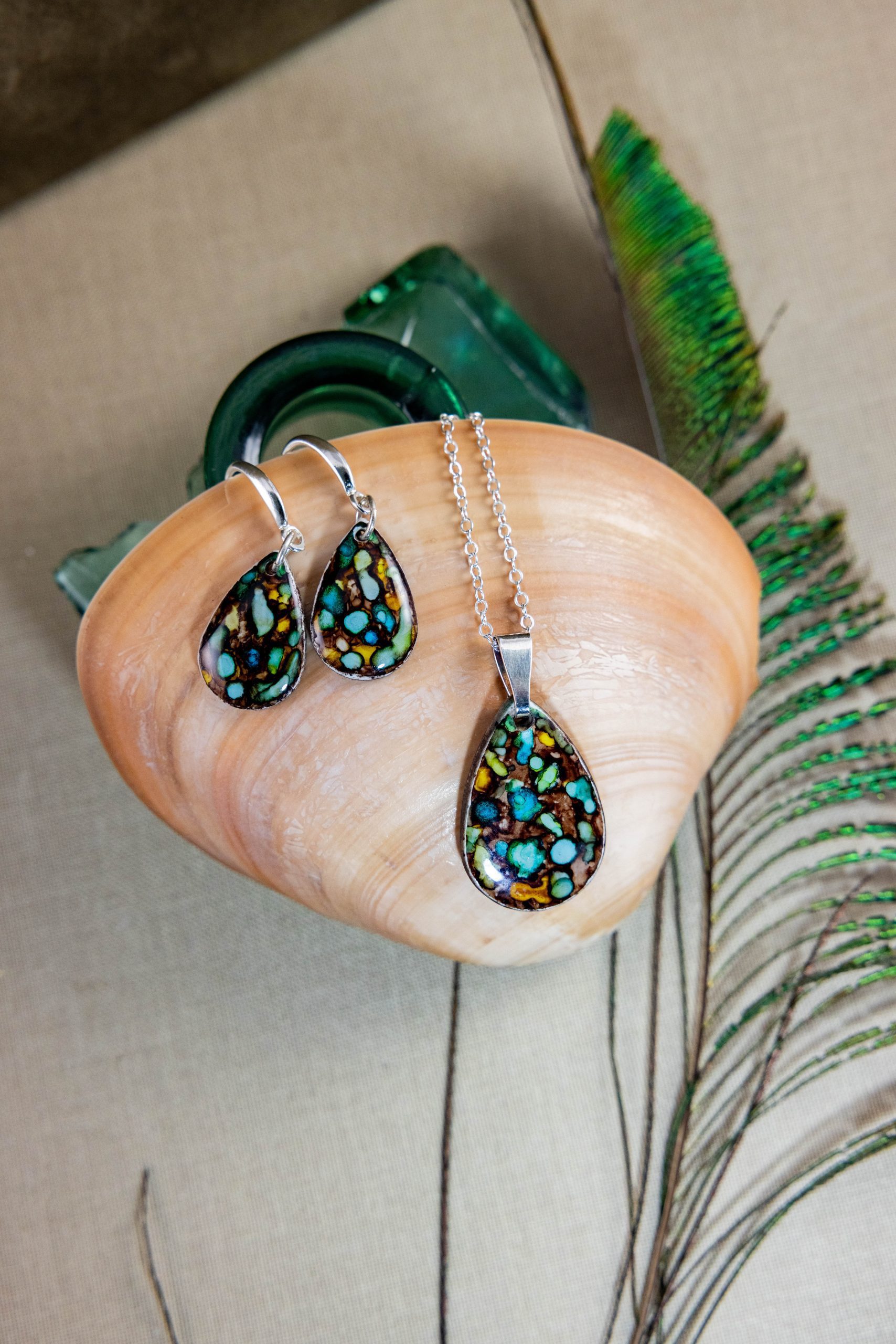 .5″ long, and 1″ long, turquoise, rustic-brown, and golden-yellow teardrop shaped ceramic trio set. This exquisite design has been handcrafted, depicting a peek beneath the earth’s surface, calling on you to set out to find your own treasures that lie beneath your surface, similar to turquoise or gold found when it is dug up. Stunning 1″ ceramic pendant is framed by the skillfully crafted earring set. “Emerald Earth Rustic Ground,” await you to surface these treasures. One of a kind. Lightweight. Recycled. Built with classy sterling silver hooks and rings, accompanied with 18″ solid sterling silver chain INCLUDED.