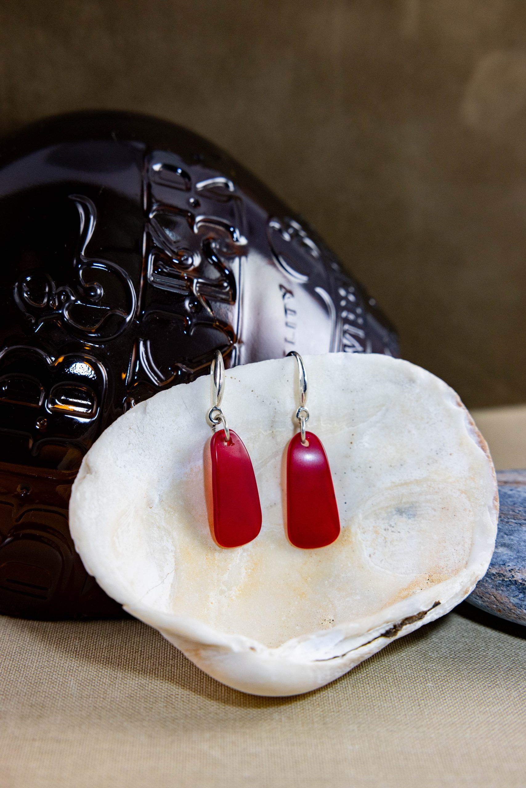 7/8″ long, rich, rare red matte finished glass, rounded edged, tri-sided, hand shaped. Masterfully handcrafted, “Fearless Intention Set,” directs you to straight ahead into your destiny with tenacity. One of a kind. Lightweight. Built with classy sterling silver hooks and rings.