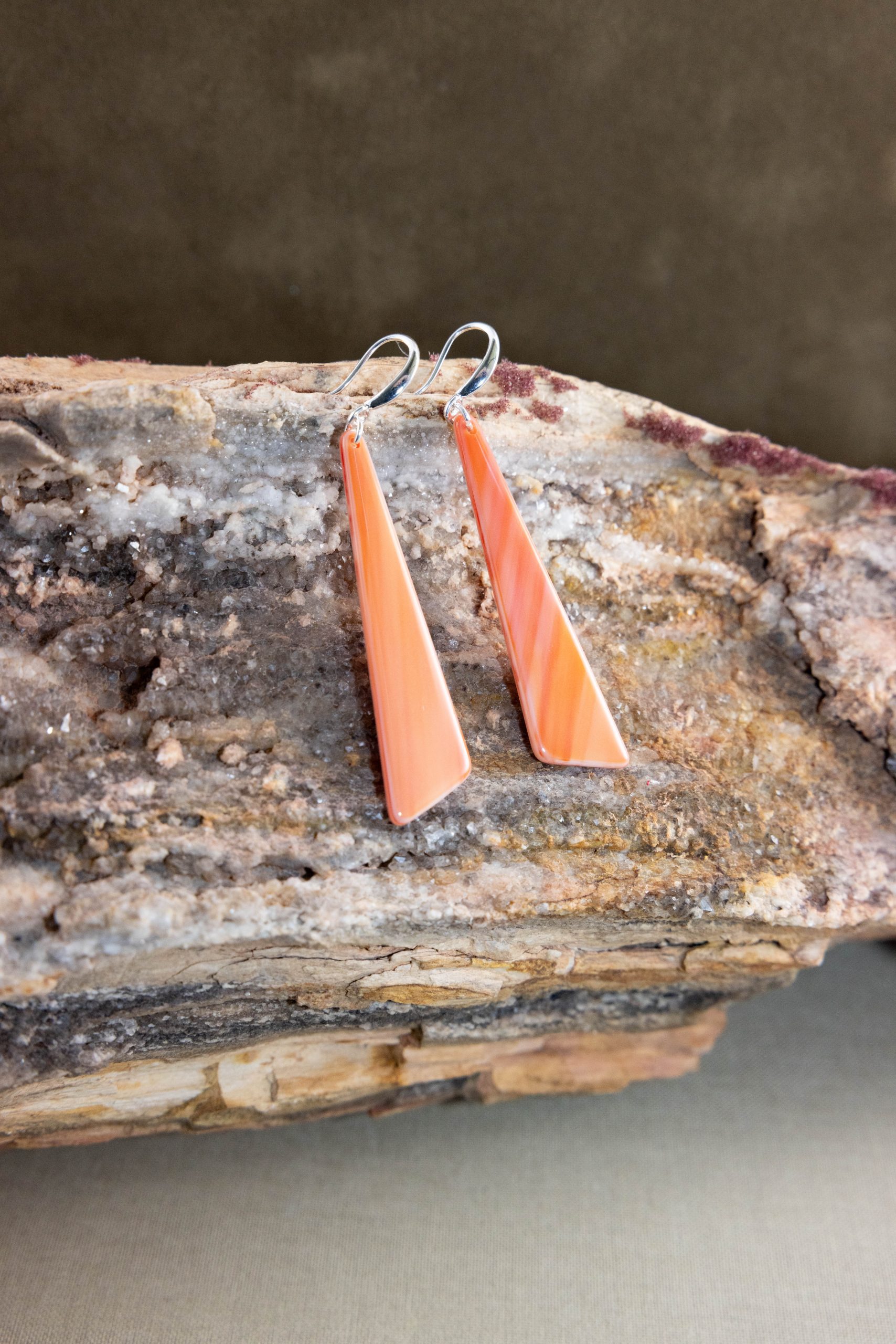 1 7/8″ long, triple sided – ignite your passion to forge ahead on your journey to create abundance with “Forget Me Not”. Two of a kind, hand shaped, vintage, stained glass display deep and soft orange tones together. One of a kind. Lightweight. Built on sterling silver hooks and rings.