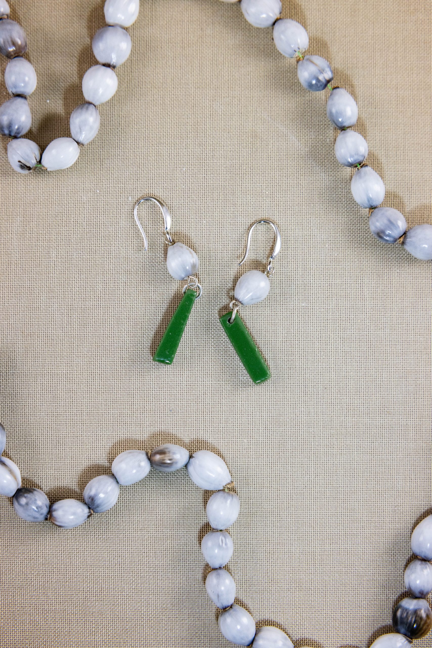 1 1/4″ long American Indian healing bead, connected with solid jade green glass rectangle rods. Handcrafted intentionally to steer you into a “Harmonious,” sense of well being and tranquility. The Trail of tears healing beads came to be known to the American Indian tribes who were forced to march 13,000 miles from the eastern regions of the United States to Tennessee and Oklahoma, wherein many died along the way. In time, stalks of corn-like pods sprung from the ground and it was said to be the fallen ancestors of American Indians guiding and healing from their place in the Universe. This pair represents prosperity and good fortune. This item is available for Reorder. To place an order, please see Reorder link. Keep in mind each pair will be uniquely handcrafted from recycled glass. Lightweight. Built with classy sterling silver hooks and rings.