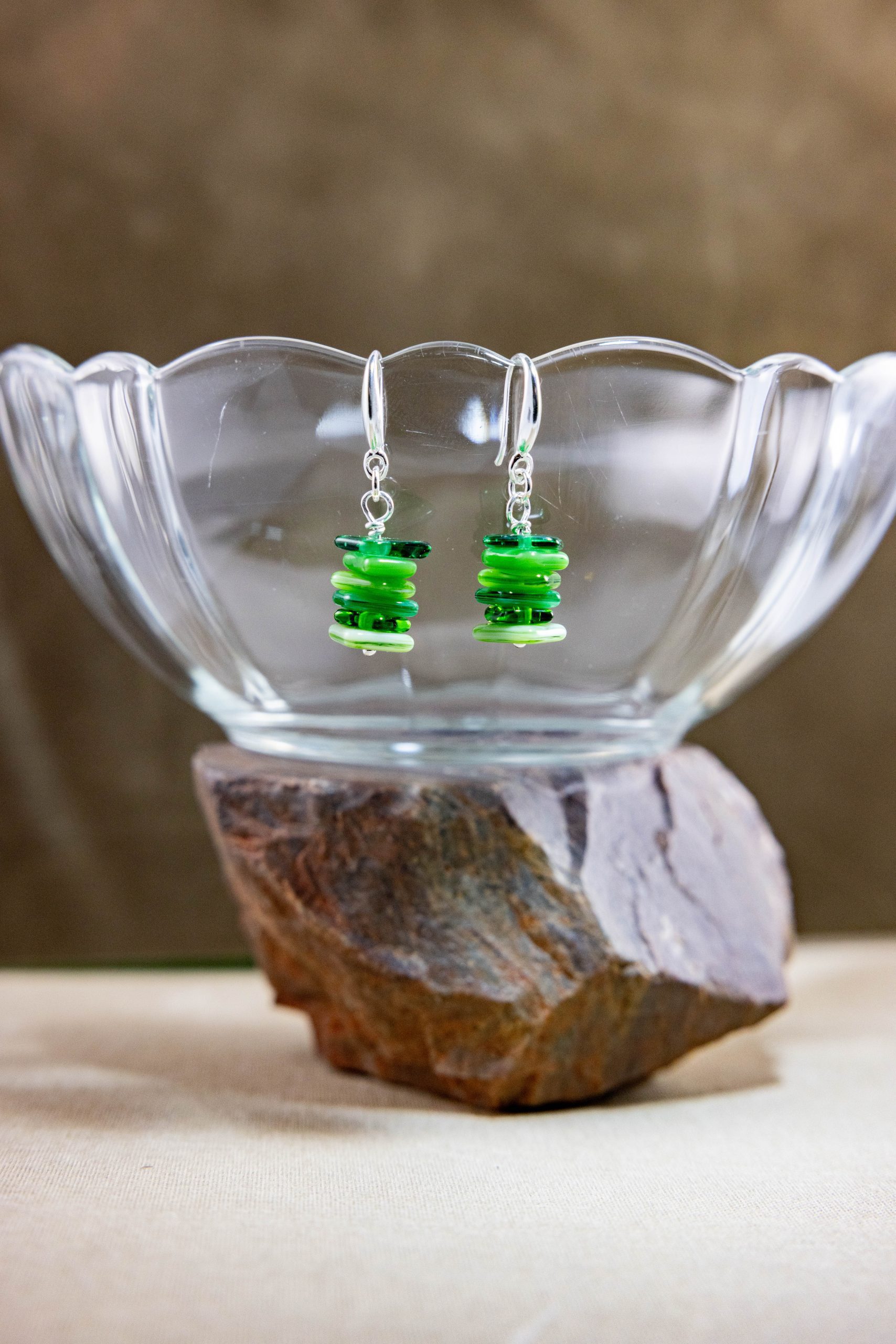 .5″ long, 6 pieces, shades of lime green and oak tree green glass, stacked top to bottom, created from discarded glass into unforgettable treasure. “Live Oak Tree” summons you to find quiet time and pause, reflect, and be still. Hand shaped harmoniously. This item is available for Reorder. To place an order, please see Reorder link. Keep in mind each pair will be uniquely handcrafted from recycled glass. Lightweight. Built with classy sterling silver hooks and rings.