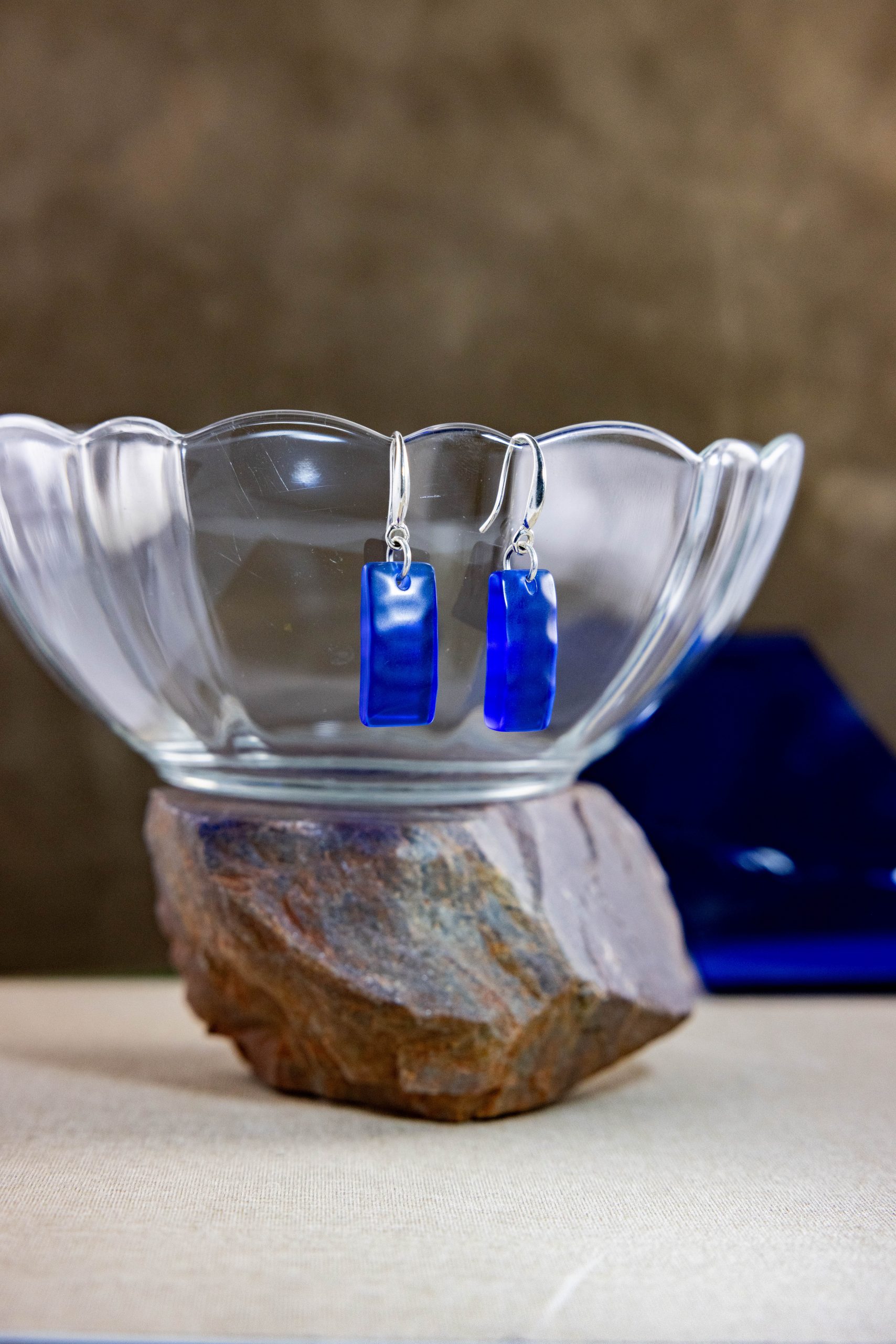 3/4″ long, deep ocean-blue, matte finished glass, unique ridges etched by hand, long rectangualr shape. Artistically handcrafted, “Notably Distinguished,” prominently represents your poise. Stand up with leadership skills in posotively impactful ways to your community and friends while, “Notably Distinguished.” This item is available for Reorder. To place an order, please see Reorder link. Keep in mind, each set will be hand made with unique characteristics. Lightweight. Recycled, Built with classy sterling silver hooks and rings.