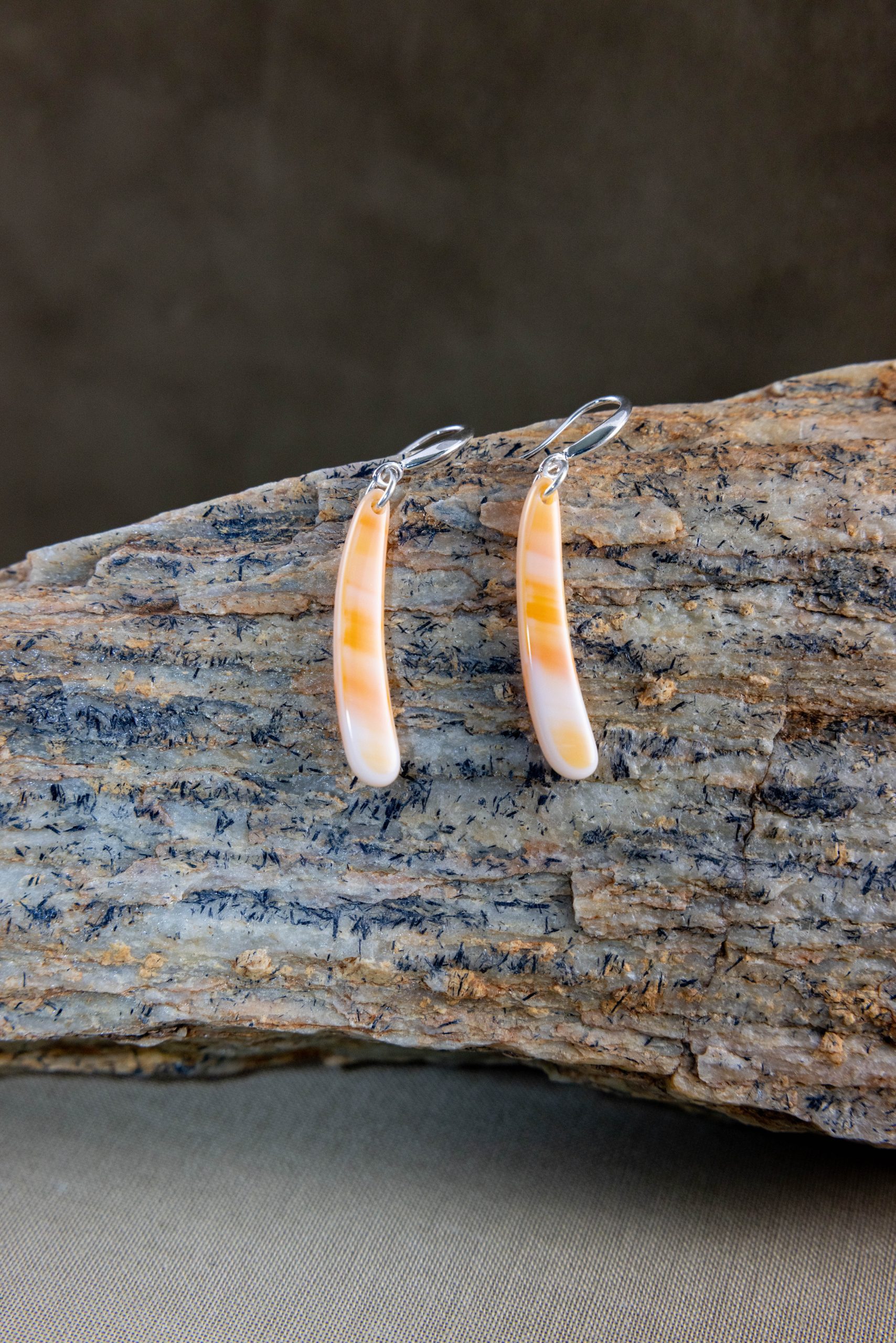 1 1/4″ orange you glad we finally made bananas out of stained glass?! “Orange Banana Stained Glass,” brings fun along with your plans each day. Remember to stay lighthearted and not take things too seriously. When you need to play, bring “Orange Banana Stained Glass,” your way! One of a kind. Lightweight. Recycled. Built with classy sterling silver hooks and rings.