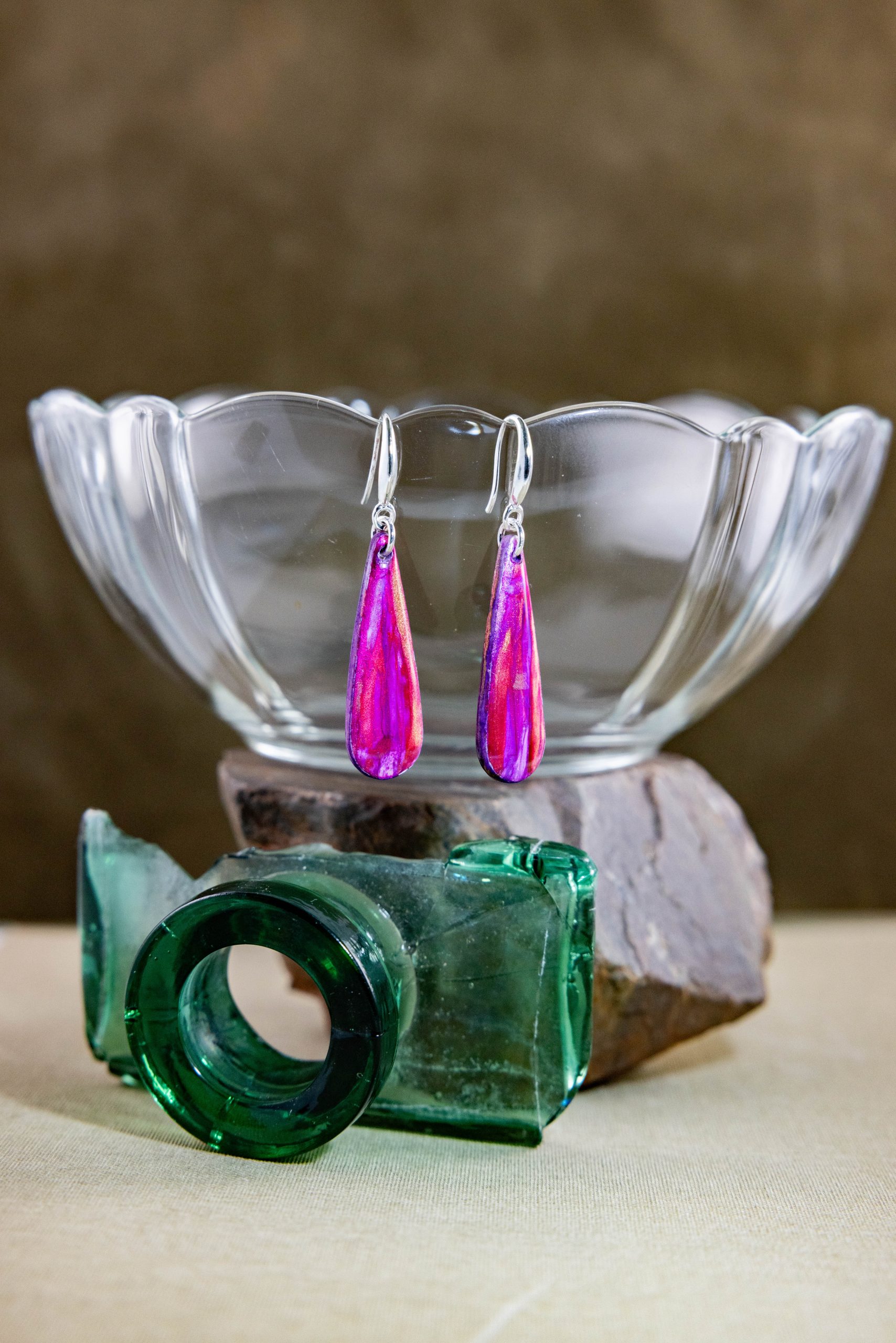 1″ long, magenta, plum-purple, narrow teardrop shaped ceramic with its silky velvet design has been freely hand painted. With masterful craftsmanship, “Pink Velvet Earth,” bloomed from clay. Illuminate your playful carefree desires and let go into a world where you get to play any roll you wish. Feel the rhythm of the ground beneath your feet, let your passion bubble up with, “Pink Velvet Earth.” One of a kind. Recycled. Lightweight. Built with sterling silver hooks and rings.