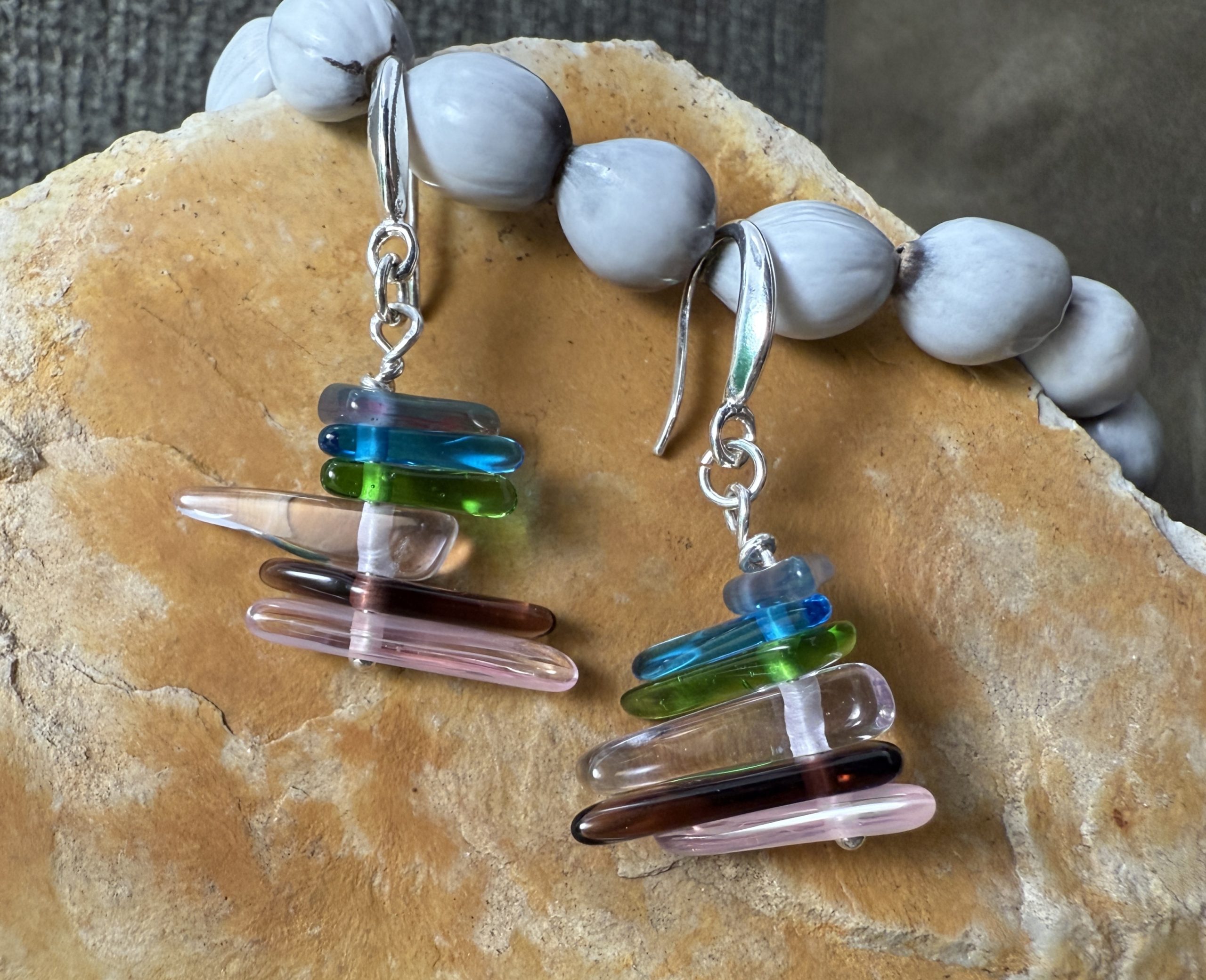 .5″ long, 6 glass pieces, multi colored with blue, pink, plum, and green, stacked top to bottom. “Plenty of Fish in the Sea,” masterfully recycled from lost or forgotten glass, recreated into unforgettable jewelry art. Imagine multi colored fish within the vast ocean darting about. Bring the spirit of the ocean and freedom of movement with you throughout your days with this special treasure. You may order more than one set, keeping in mind each pair will be uniquely handcrafted from recycled glass. Lightweight. Built with classy sterling silver hooks and rings.