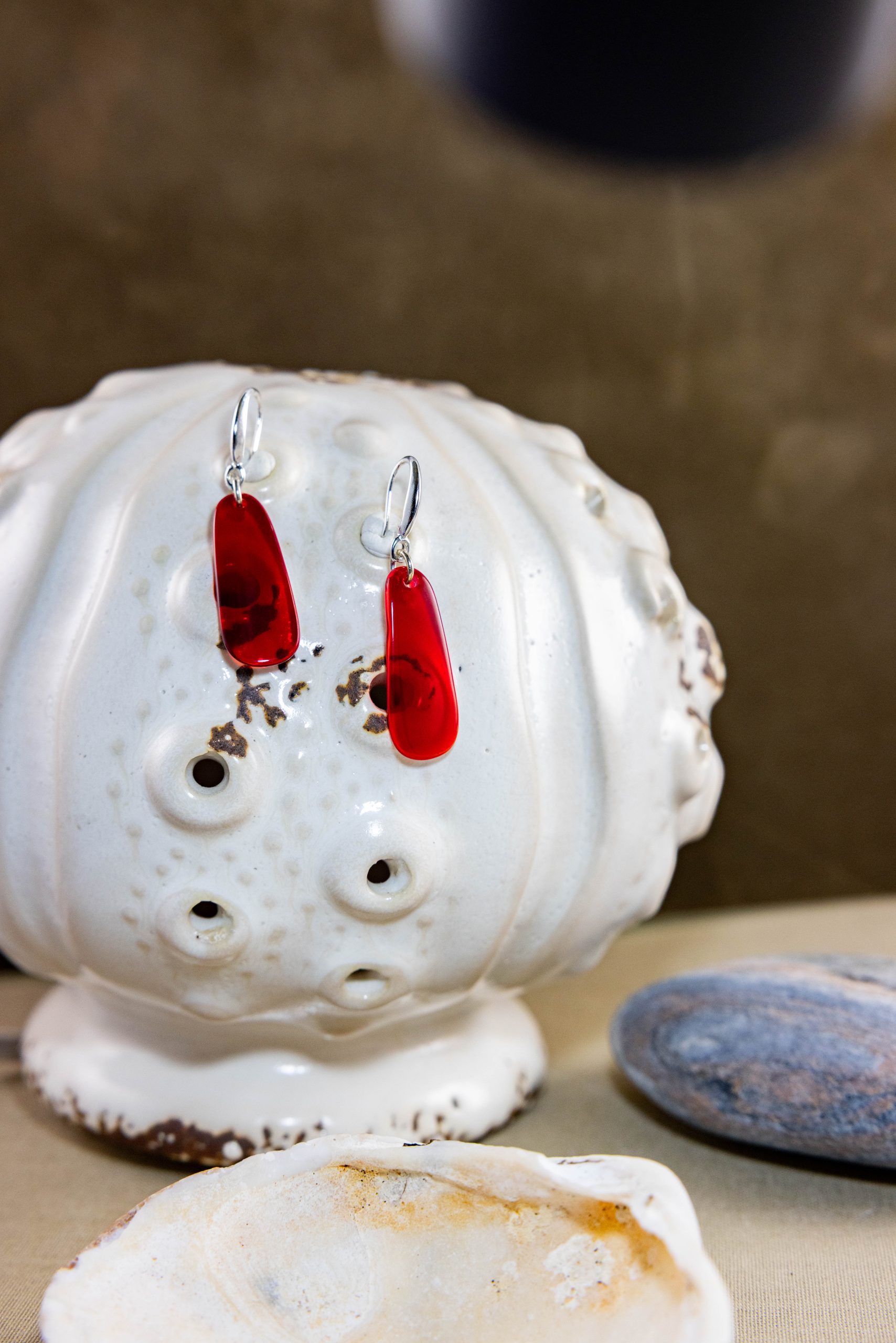 1″ long, radiant, cherry-red, shiny glass. Masterfully hand shaped ovals. “Radiant Soul,” reminds you to feel your heart beat radiate. Remember to remember that this is the best day of your life. Just like you, this pair comes from a rare material and is one of a kind. Lightweight. Recycled. Built with classy sterling silver hooks and rings.