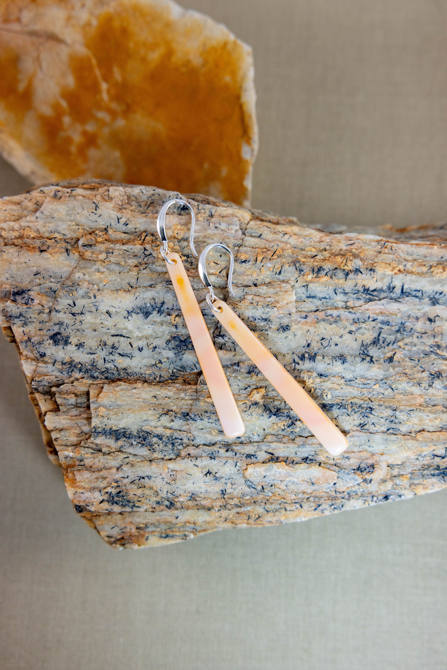 1 7/8″ long, narrow hand shaped vintage stained glass peacefully light the flame within you with their uniquely soft orange and cream swirl. This one of a kind pair is recreated as “Stained Glass Candle Sticks.” Lightweight. Recycled. Built with classy sterling silver hooks and rings.